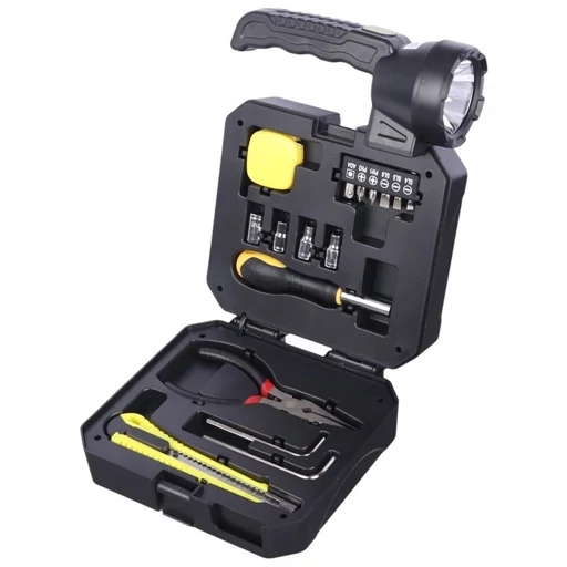 📌دارای محفظه ی جعبه ابزار شامل(متر،دم باریک،پیچگوشتی با سری های مختلف،سری های بکس،کاتر و دسته بکس)